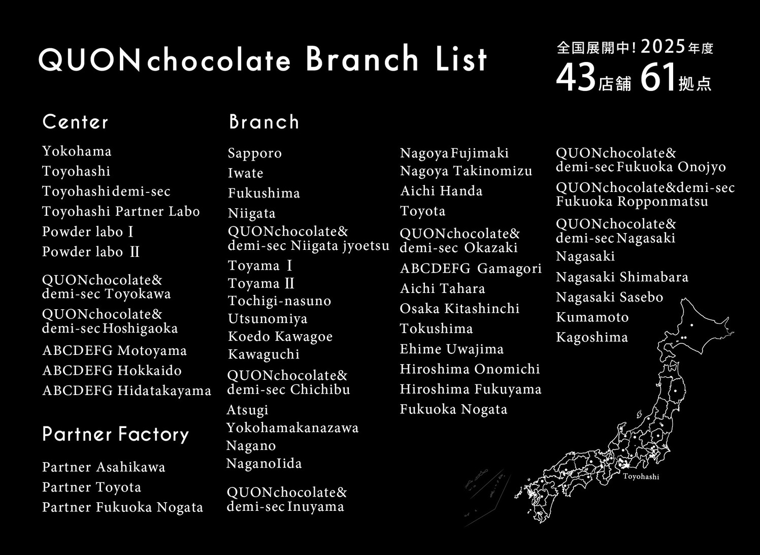 - QUONチョコレートは、障がいを持つ方やママさんなど、多様な方々によって創られています。全国の多様な方々がショコラティエとなり、妥協のないモノ作りを追求しています。